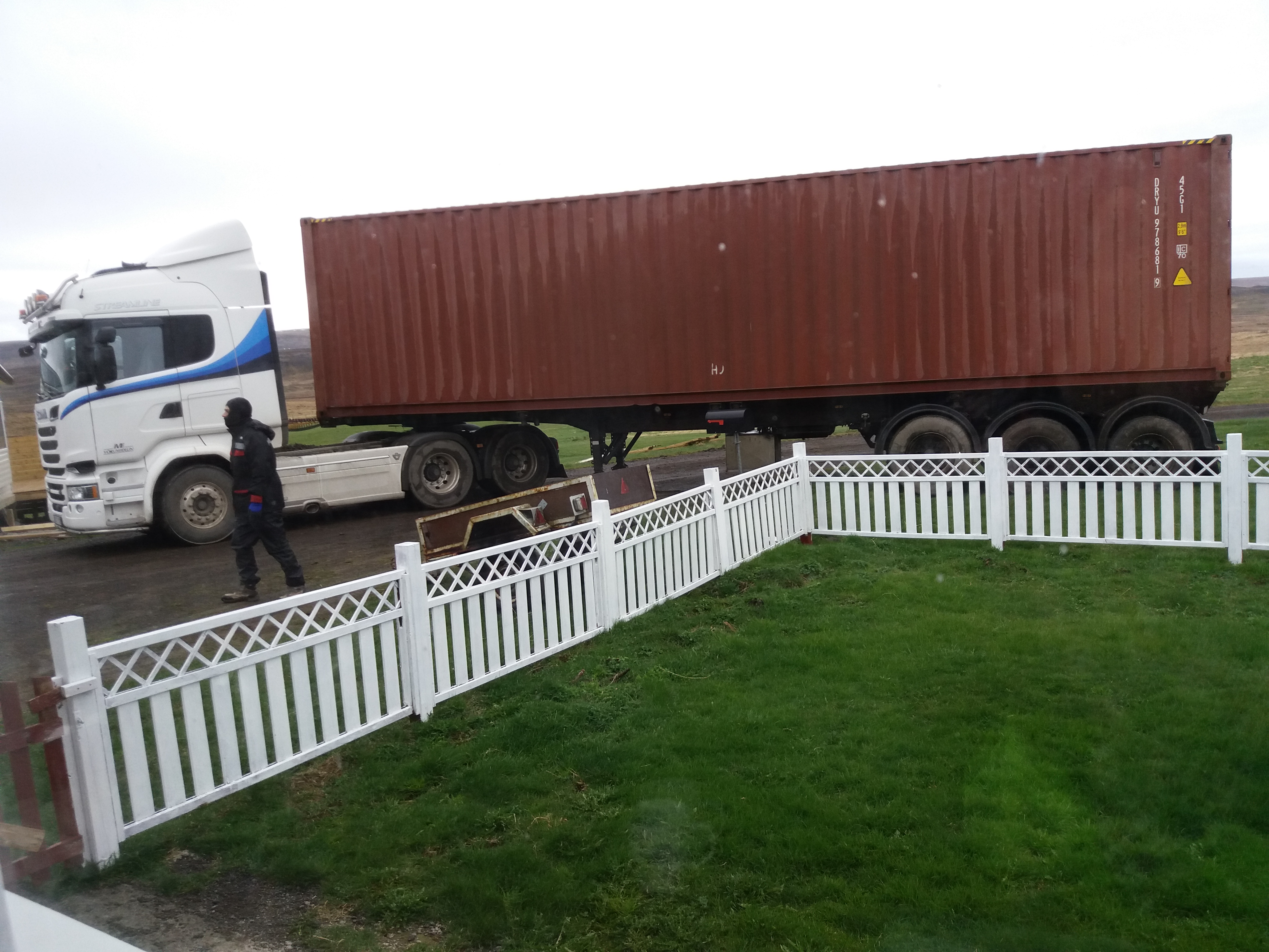 Fyrri gámurinn kominn í hlað.