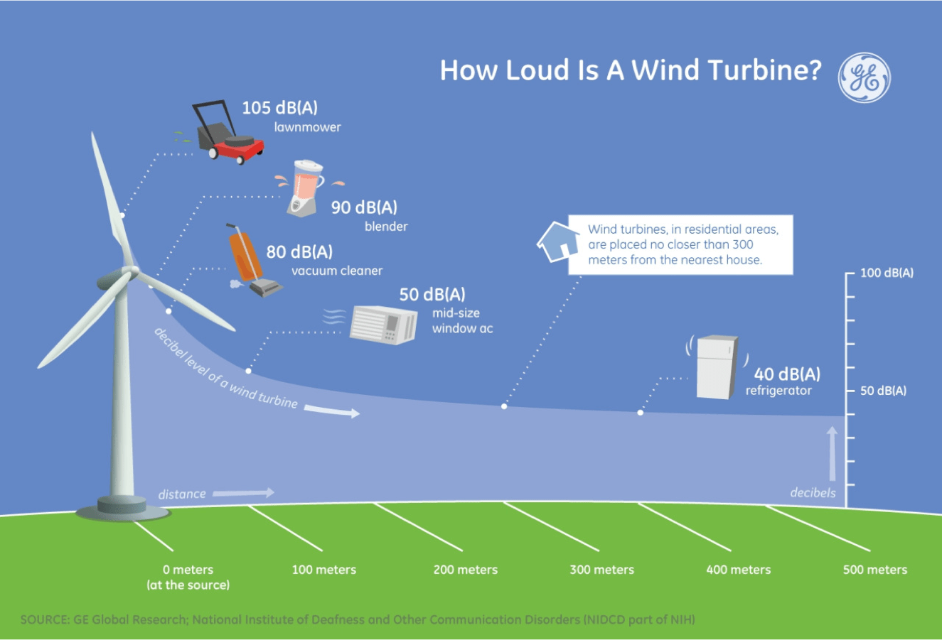 General Electric (GE) hefur sett fram á myndrænan hátt samanburð hljóðstyrks frá vindmyllum og ýmissa algengra rafmagnstækja, sjá mynd.